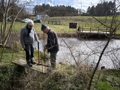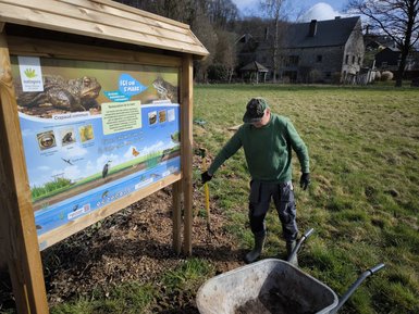 Ce jeudi ensoleillé, pendant qu'une partie de l'équipe — Isabelle, Bernadette, Bruno et Karl — menait une opération de gestion (enlèvement partiel des orties pour dégager le chemin vers la rivière, recouvrement des parties en béton du ponton, etc.), l’entreprise "Contact Nature" a procédé à l’installation du panneau didactique.